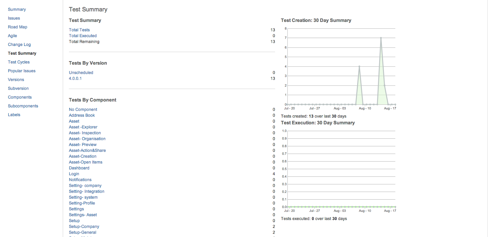 Zephyr has a basic reporting scheme — the number of total tests executed and the tests remaining in a project can be seen in the test summary. The tests can also be displayed based on the version or any other Jira label where they are grouped.